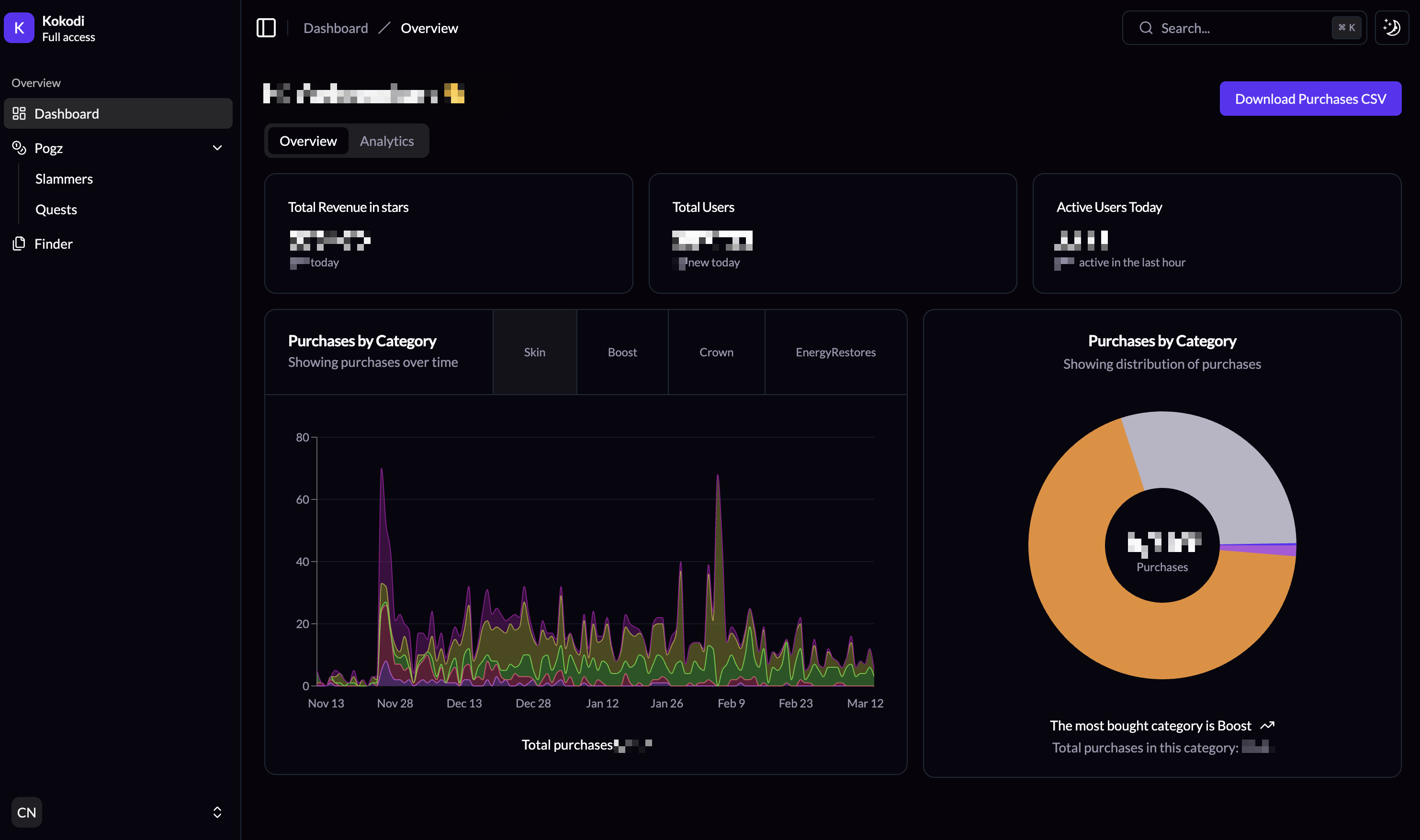 A standout feature of Kokodi Pogz is its integration of Telegram Stars, Telegram’s in-app virtual currency for purchasing digital goods and services. By leveraging Telegram’s familiar interface and trusted payment flow, we provided a user-friendly monetization method for the game.