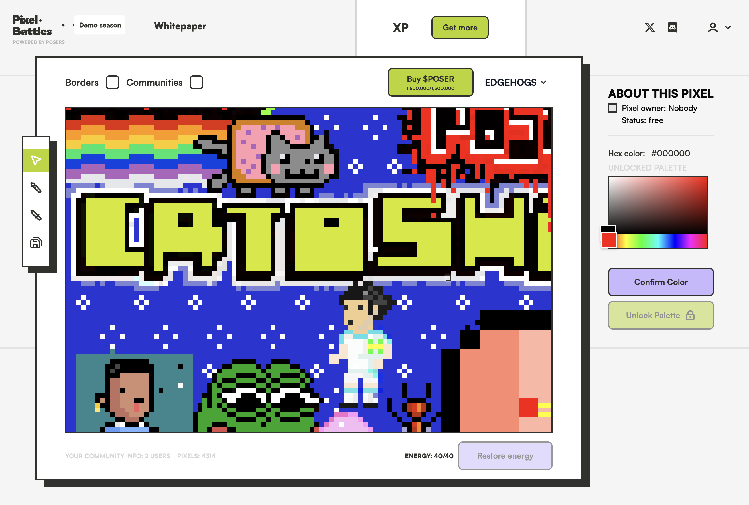 Pixel Battles is an interactive web application that combines collaborative pixel art with competitive gameplay mechanics. As the technical lead for this project, I designed and implemented a real-time platform where users connect their crypto wallets to join communities, claim territory on a shared canvas, and engage in strategic battles using NFT-based units. The game features a unique blend of artistic expression and competitive gameplay, allowing users to both create pixel art and compete for territorial control through an innovative battle system.