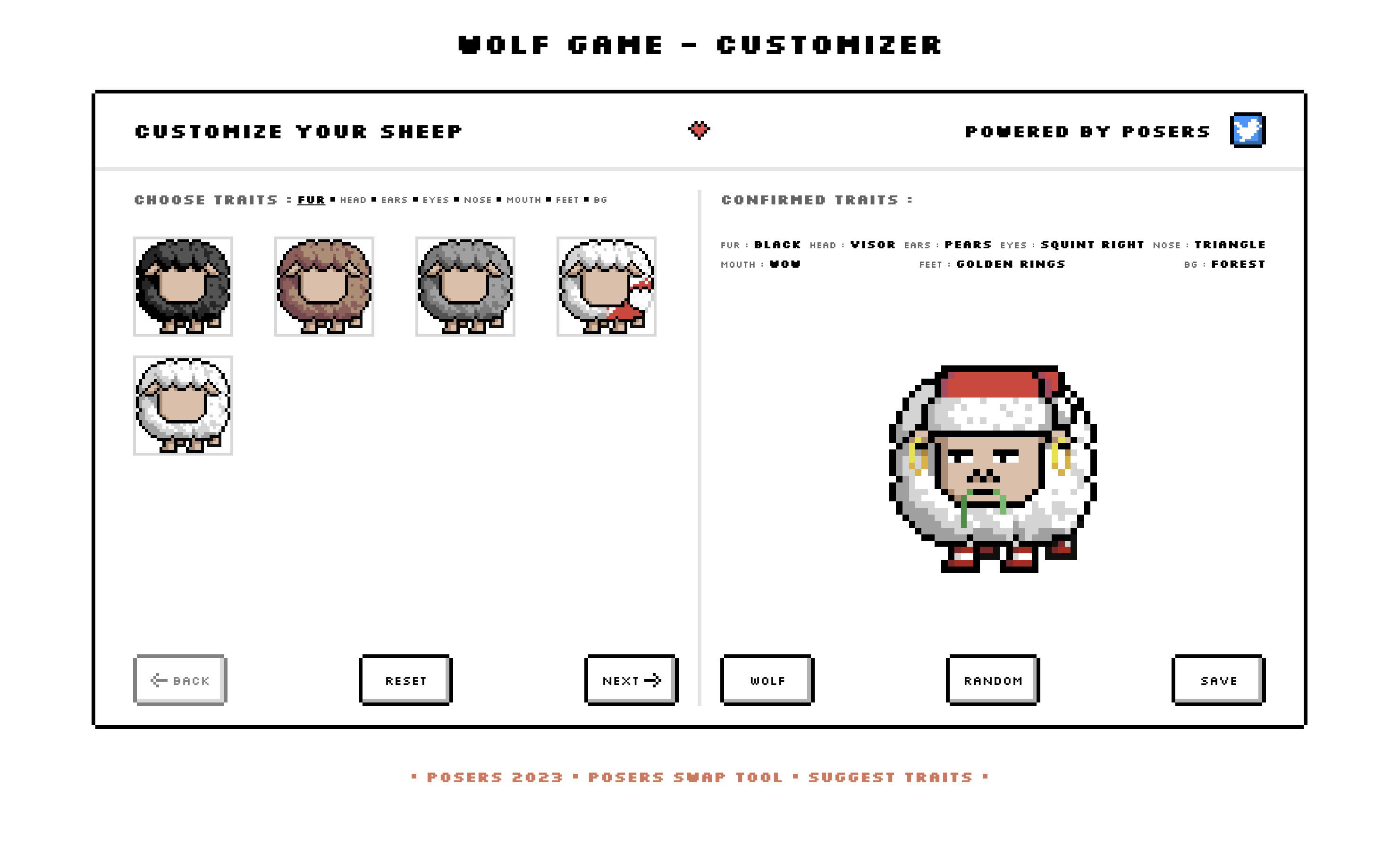 As a marketing initiative between Posers and Wolf Game, I was tasked with developing a character customization tool that would allow users to create and customize their own Wolf Game characters. This interactive tool was designed to generate interest in both collections and provide an engaging experience for community members.